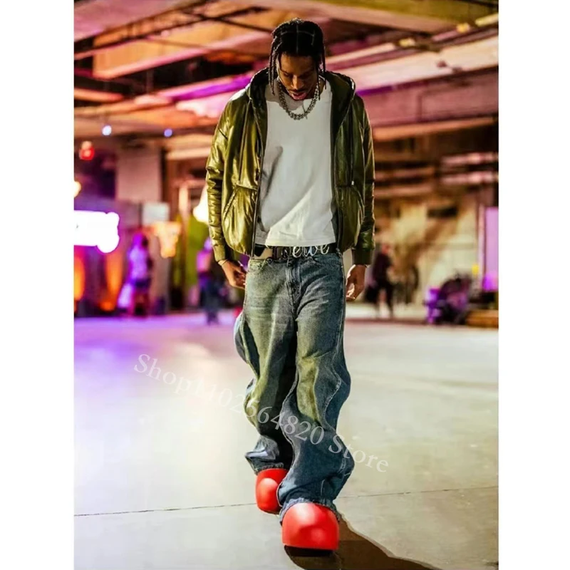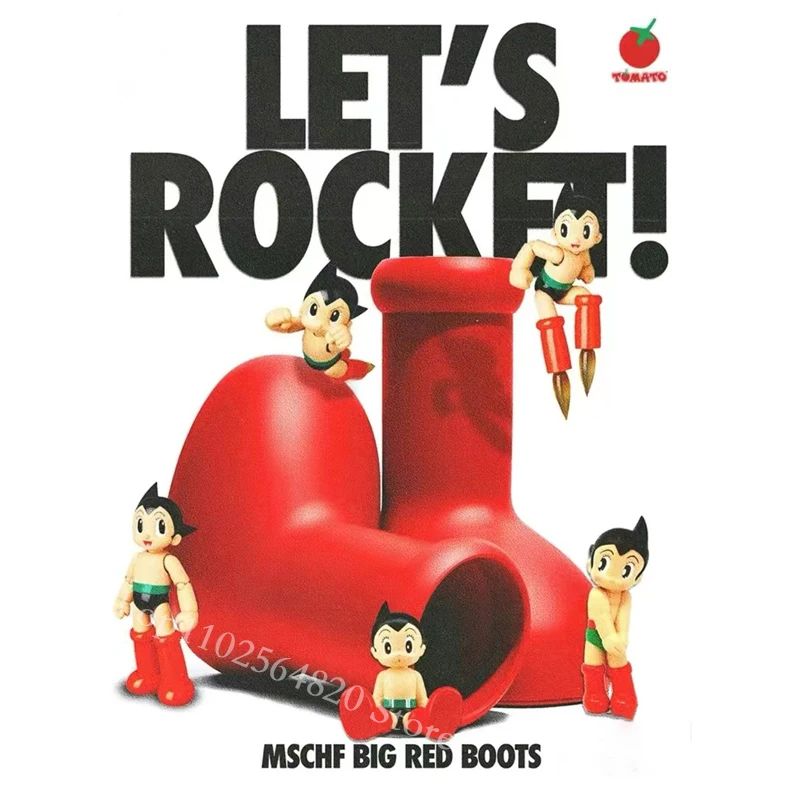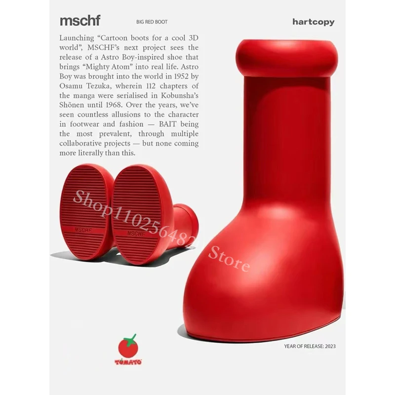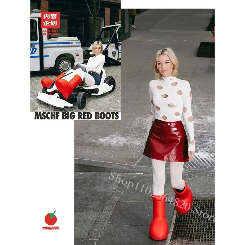 Red Boots Rain Boot Thick Bottom Big Round Toe Flat Slip-On New Fashion Cartoon Boots Women Men‘ Walk Show Shoes Cute Spring