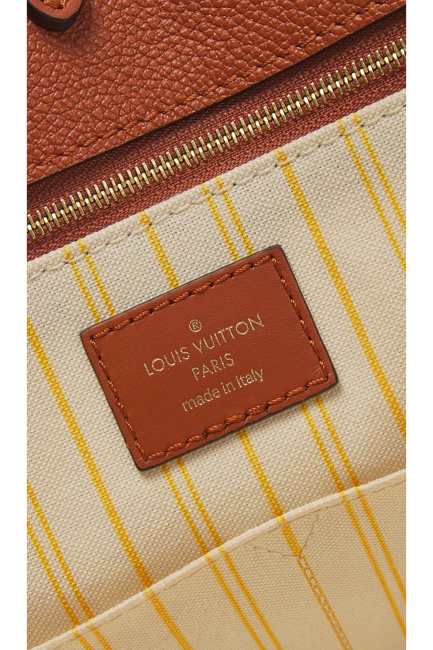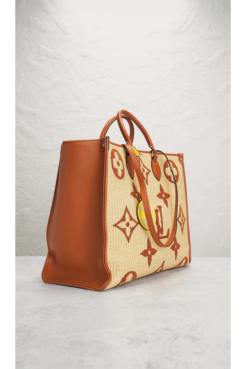 Monogram raffia with striped textile lining, leather trim and gold-tone hardware