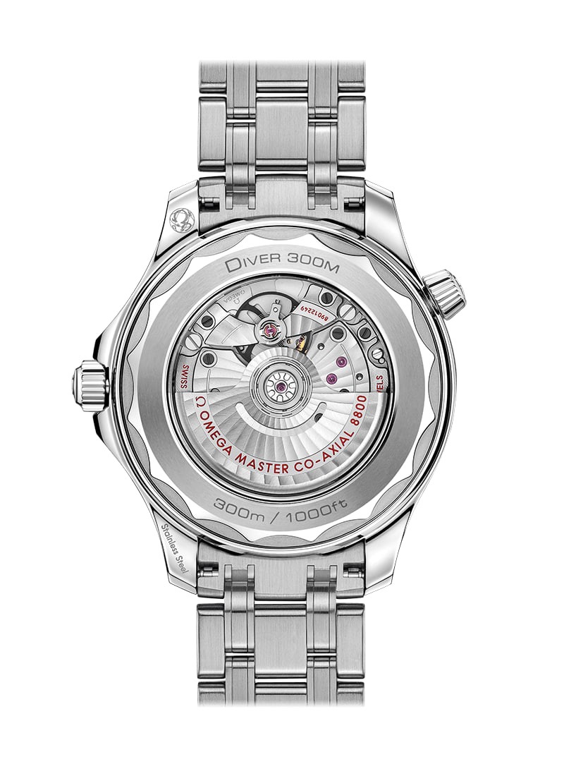 Fitted with a stainless-steel bracelet, the watch houses the OMEGA 8800 Ultimate chronometer calibre and is clearly visible through a sapphire glass case back with rippled edges.